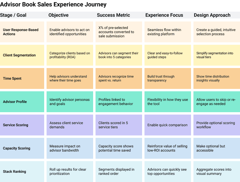 Validation tested whether the new Client Segmentation & Monetization flow made it easier for advisors to identify low-revenue accounts, package them for sale, and maintain client service continuity.