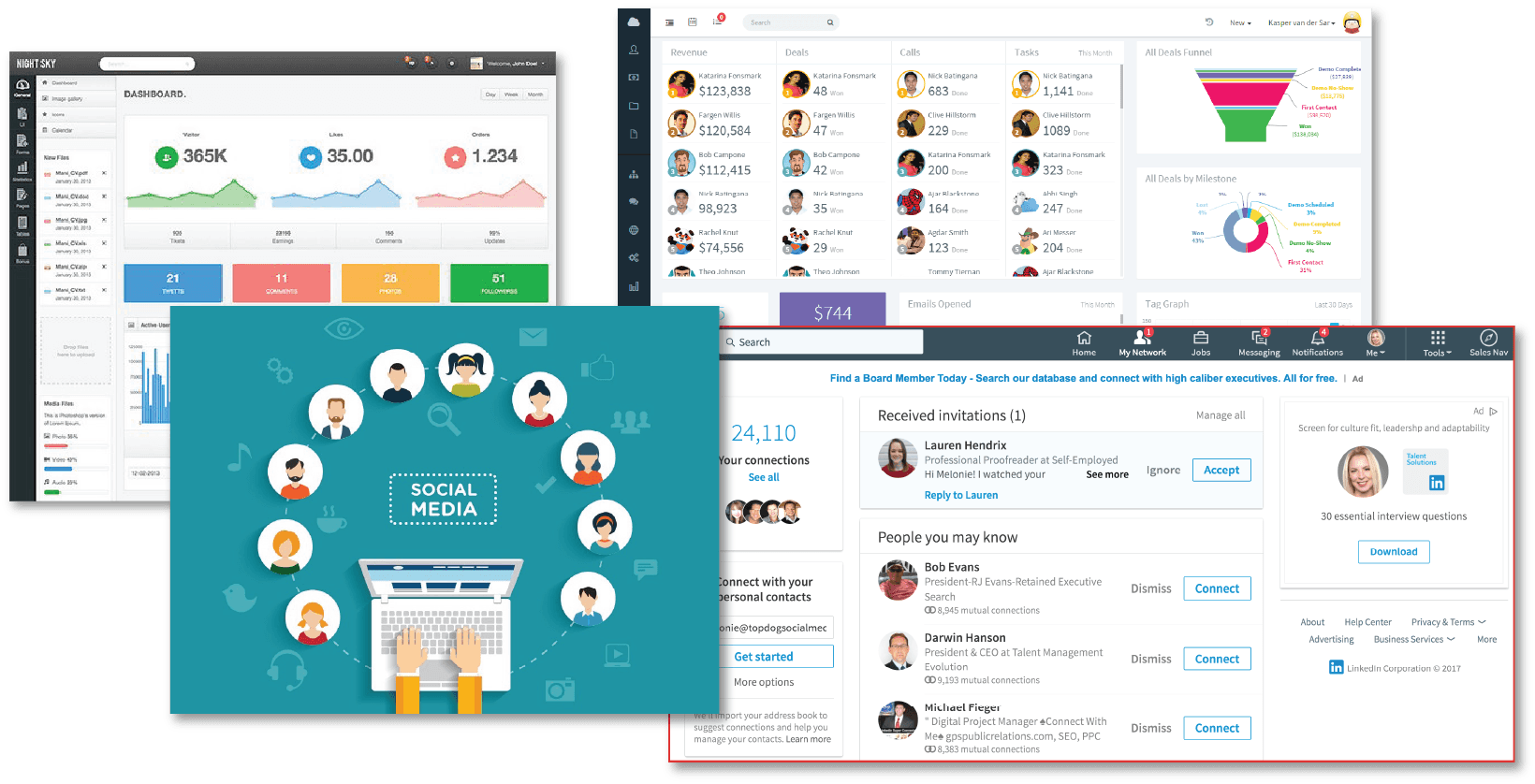 Research: competitive analysis, inspiration from dashboards and social media layouts.